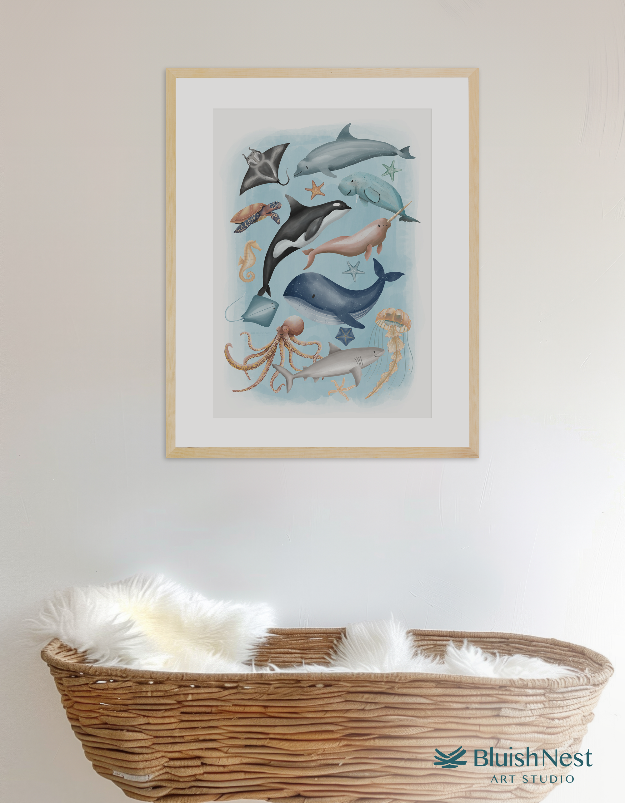 Add a splash of fun and learning to your nursery with this delightful set of two nursery wall art prints: Alphabet Animals and Sea Animals. The Alphabet Animals print features adorable hand-drawn creatures for each letter, while the Sea Animals print showcases the ocean’s most beloved sea life. Perfect for your baby nursery or child's room or play space decor. Ideal for baby shower or baby gender reveal gifts too.