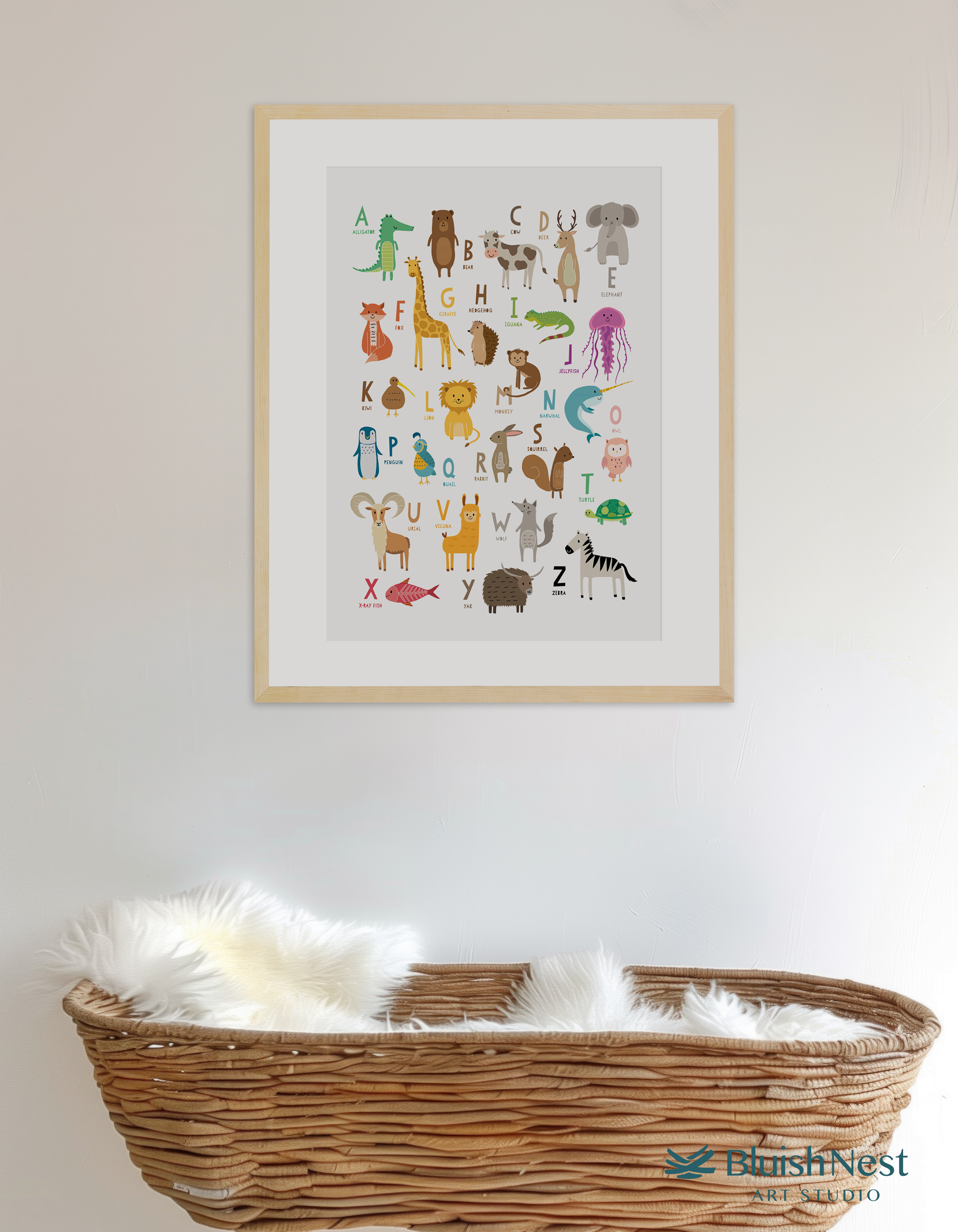 Make learning the alphabet an engaging adventure with our friendly Animal Alphabet nursery print. From the cheerful alligator representing the letter A to the stripy Zebra for the letter Z, each illustration is designed to capture a child's imagination.