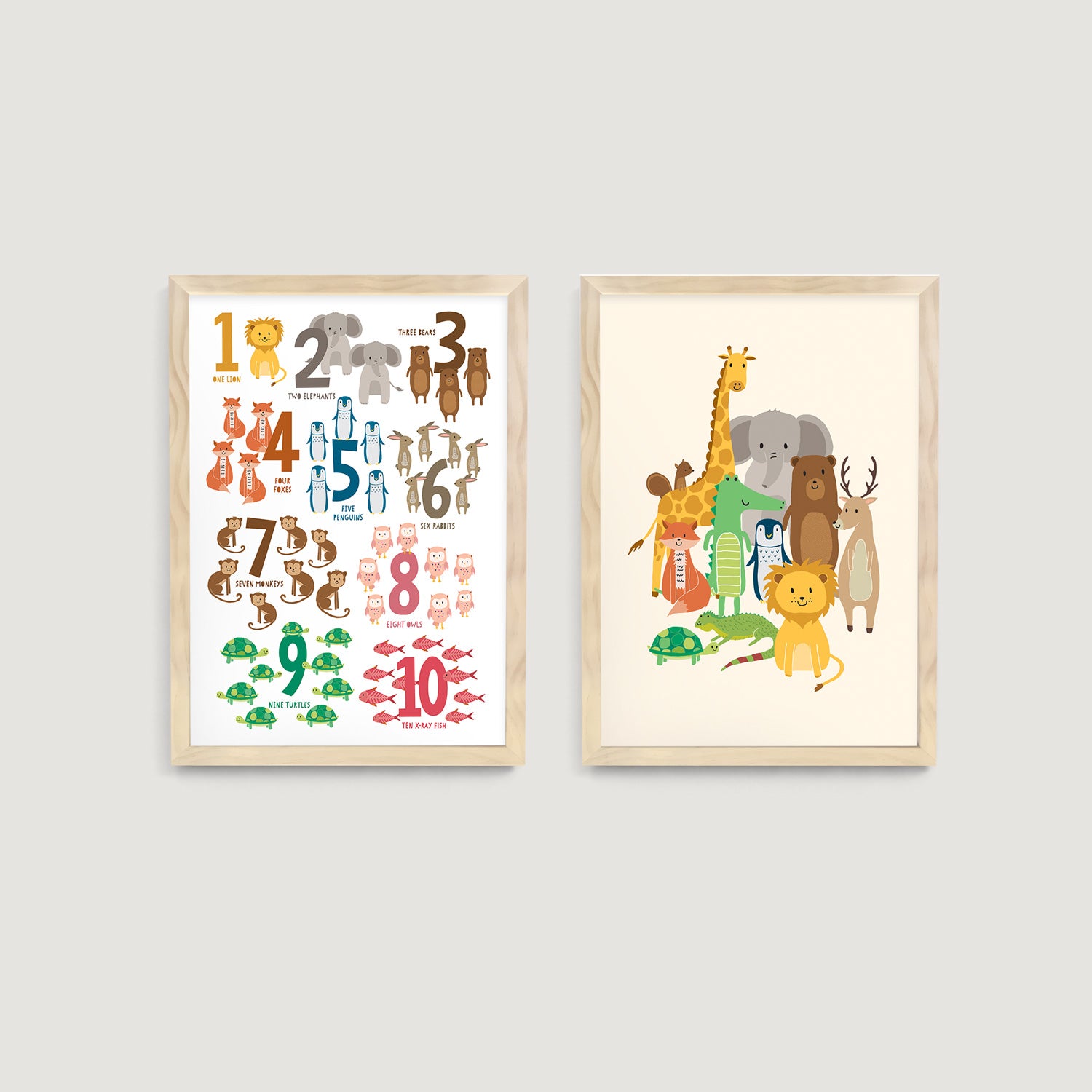Featuring our original Animal Friends wall art print—the inspiration behind many of our designs—and the educational Animal Numbers print, this duo combines learning with charming animal illustrations. Curated to save you time and effort, this set will be a great addition to your nursery or child's room decor. Ideal for baby shower or baby gender reveal gifts too.