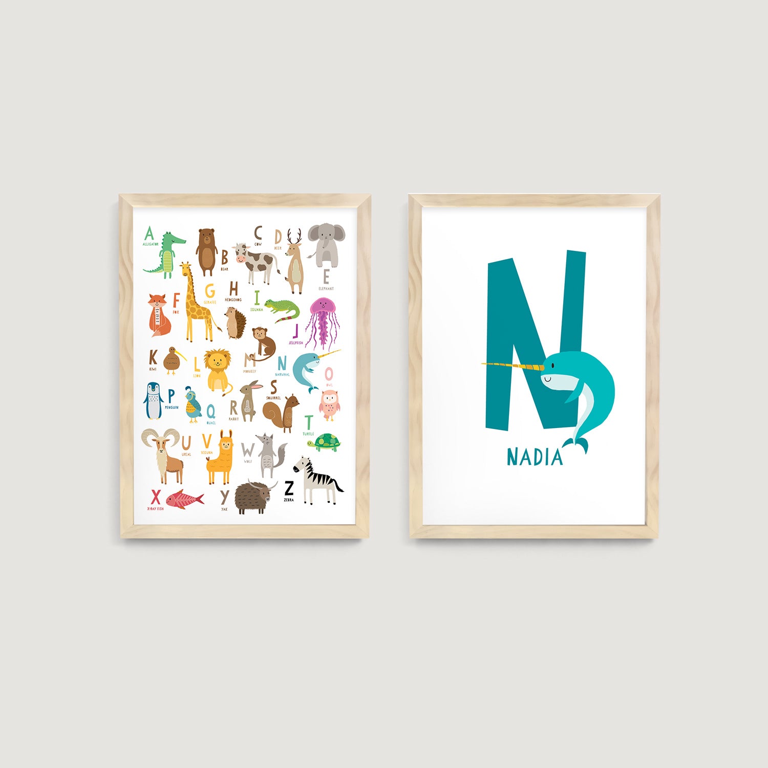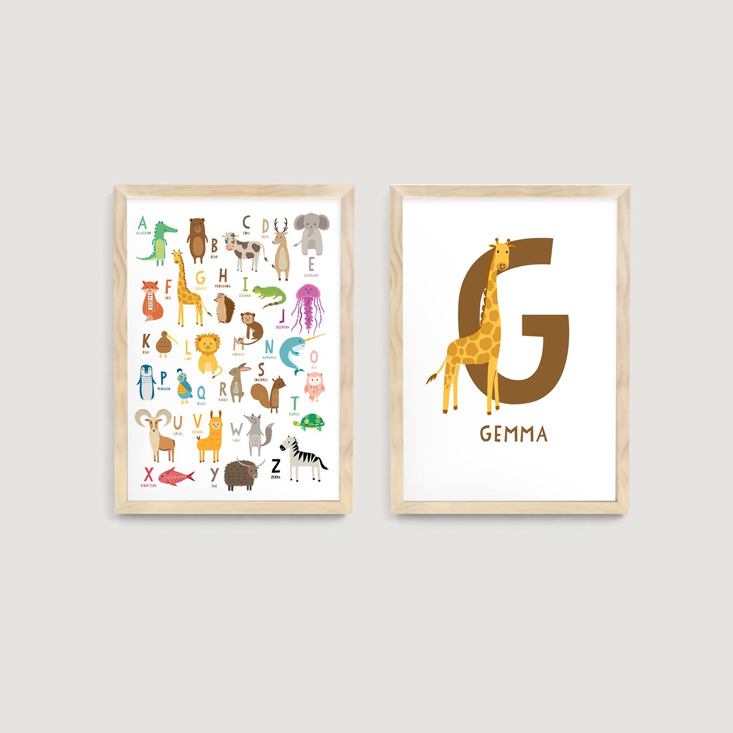 Elevate your little one's space with this adorable and unique two-print set, a perfect addition to any baby nursery or child's room decor. This educational collection features a playful alphabet animals print paired with a special personalised name letter print.