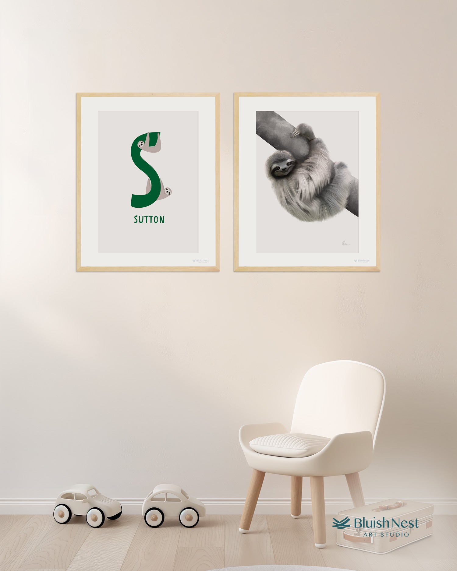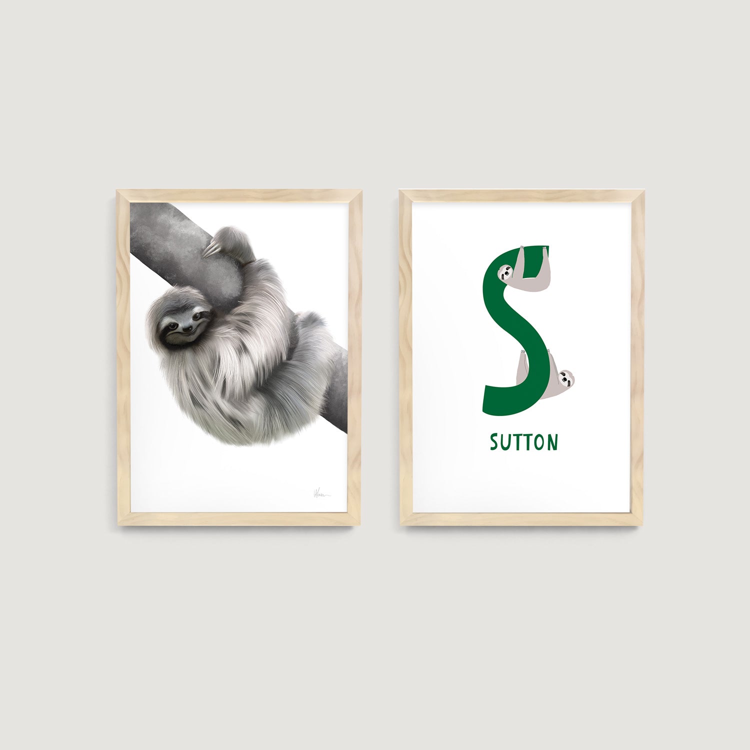 The set includes our realistic sloth nursery print and a personalised name letter print from the Alphabet Animals series featuring a quirky, hand-drawn sloth on your child's first initial.