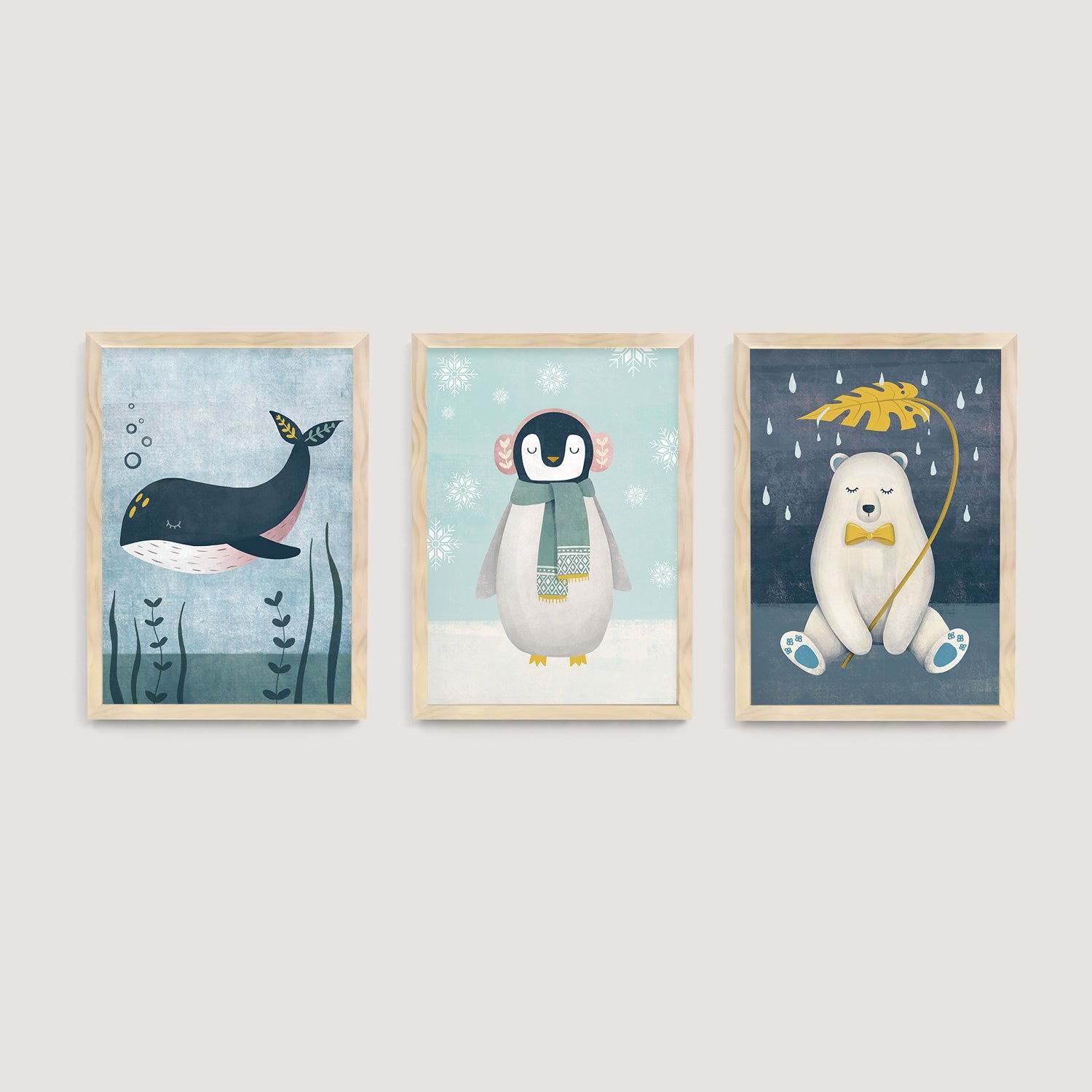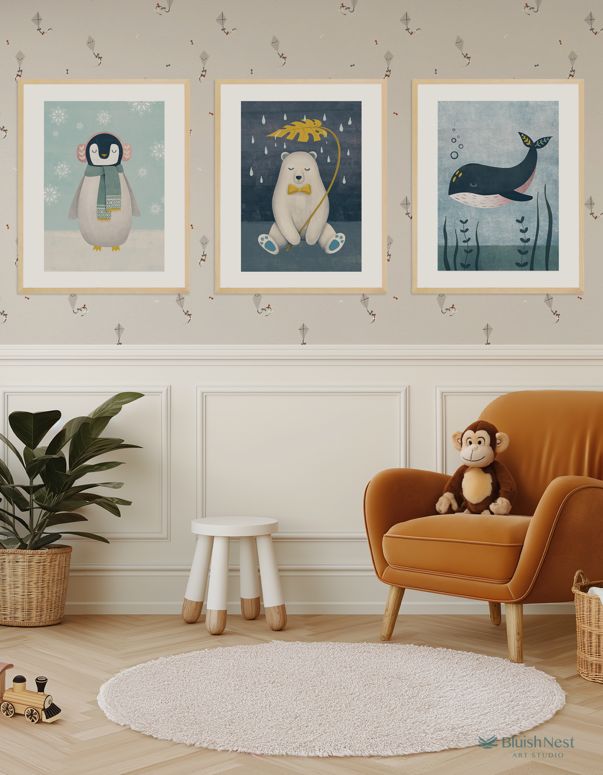 Create a serene space for your nursery with this charming set of three whimsical wall art prints. This set features a Polar Bear, a Penguin, and a whale.